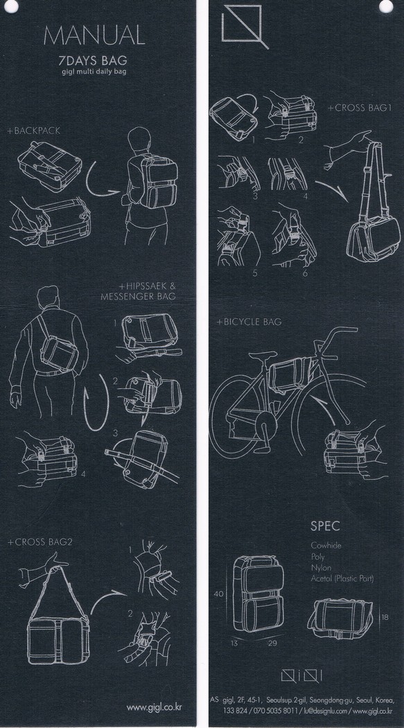 7Days Bagは1つのバッグなのに、ショルダーにもバックパックにも、あるいはメッセンジャーバッグや自転車用のフロントバッグにまで、全部で7通りの使い方ができます。